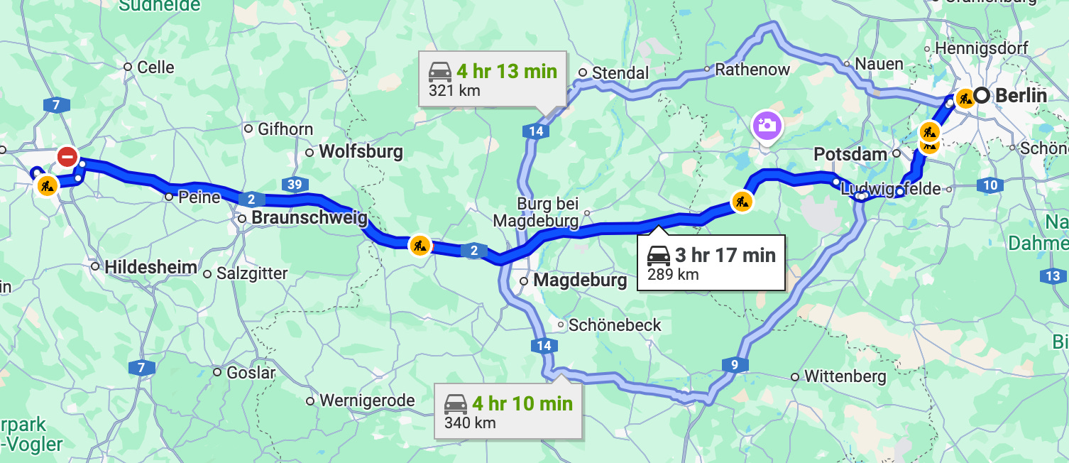 Let’s plan for a trip: We’d like to travel from Berlin to Hanover. Which route should we take? Asking Google Maps, it shows us three routes: