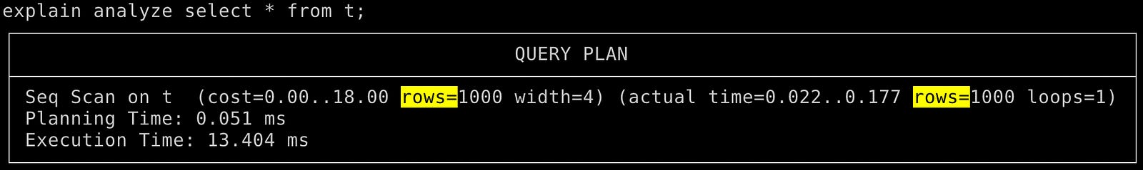 │ Seq Scan on t (cost=0.00..15.00 rows=1000 width=4) (actual time=0.025..0.095 rows=1000 loops=1) │