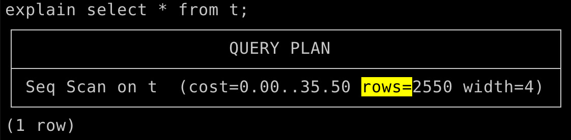 └──────────────────────────────────────────────────┘PostgreSQL now accurately recognized the number of tuples in the table and provided correct estimates for queries: